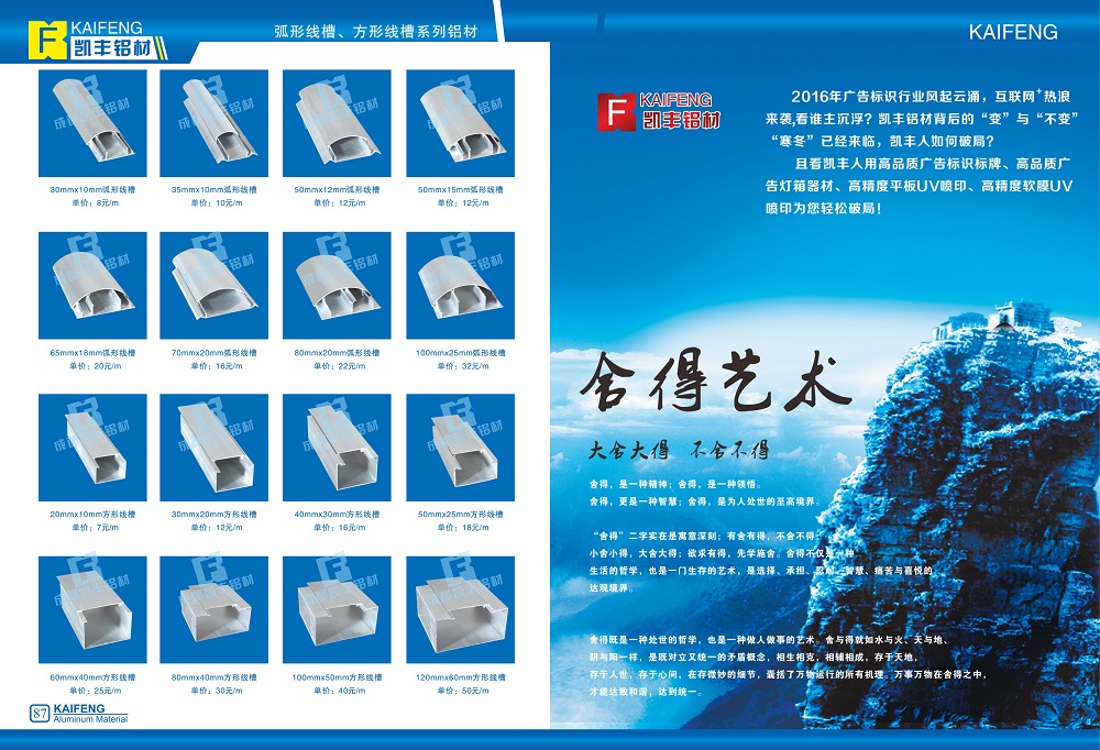 凱豐鋁材以其優良的品質,良好的綜合性能和周到的服務,贏得了廣大客戶和社會各界的青睞。為工業自動化設備、機械防護設備、廣告、裝飾領域提供廣闊的設計空間。公司持續的質量改進作為企業的永恒目標,形成以“勤奮改變世界、誠信贏得世界、品質提升世界、服務感動世界、科技創造世界、竟博挑戰世界、智慧征服世界”具有凱豐嘉特色的企業文化,使公司具有強大的凝聚力和發展后勁。